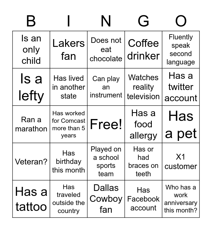 This bingo card has a free space and 24 words: Has birthday this month, Has traveled outside the country, Can play an instrument, Has a tattoo, Fluently speak second language, Is an only child, Is a lefty, Lakers fan, Has a food allergy, Played on a school sports team, Watches reality television, Ran a marathon, Has or had braces on teeth, X1 customer, Has lived in another state, Has Facebook account, Has a pet, Does not eat chocolate, Has a twitter account, Has worked for Comcast more than 5 years, Who has a work anniversary this month?, Veteran?, Coffee drinker and Dallas Cowboy fan.