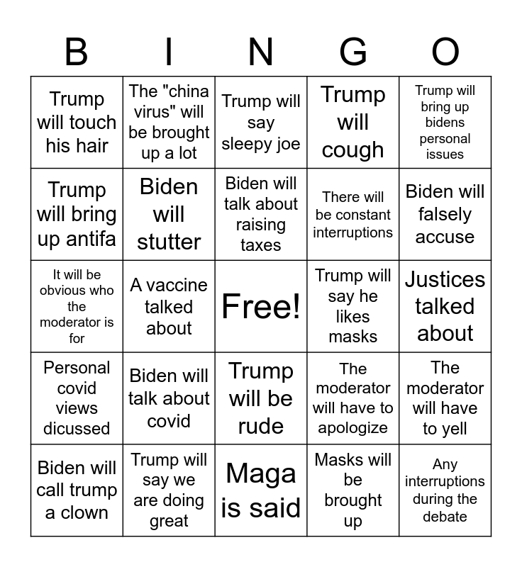This bingo card has a free space and 24 words: Biden will talk about covid, Trump will say we are doing great, Biden will talk about raising taxes, Biden will call trump a clown, Trump will bring up bidens personal issues, Trump will touch his hair, Trump will bring up antifa, The "china virus" will be brought up a lot, Trump will say he likes masks, Trump will be rude, There will be constant interruptions, It will be obvious who the moderator is for, The moderator will have to apologize, The moderator will have to yell, Biden will stutter, Masks will be brought up, Justices talked about, Trump will say sleepy joe, Biden will falsely accuse, A vaccine talked about, Any interruptions during the debate, Personal covid views dicussed, Trump will cough and Maga is said.
