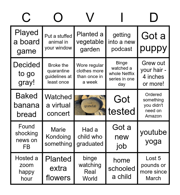 This bingo card has a free space and 89 words: A day in pajamas, certain you've got the virus, binge watching Real World, a pet attended a zoom meeting, brand new hobby, art project, super-cleaned your bathroom, Rode your bike, day drinking, 1000 piece puzzle, Cut your own hair, Joined a virtual conference, getting into a new podcast, youtube yoga, read a book, Marie Kondoing something, hands cracking from washing, home schooled a child, Dyed your own hair, decide to learn new language, Sat on your front porch, Went thru a McDonalds drive thru, Binge watched a whole Netflix series in one day, midday luxurious nap, Baked banana bread, Remodeled a room in your house, Baked a loaf of bread, Ran out of TP, Braved Costco, Went to the mailbox in your PJs, Broke the quarantine guidelines at least once, Wore regular clothes more than once in a week, Watched Tiger King, Got a puppy, Made a home office in your kid's bedroom, Put a stuffed animal in your window, Planted a vegetable garden, Gained the COVID -15, Ordered something you didn't need on Amazon, Mailed a hand-written letter or note, Went somewhere and forgot your mask, Attended a wedding during COVID, Attended a funeral during COVID, Developed "Mask"ne - the new acne., Hosted a zoom happy hour, Attended more than 12 zoom meetings, Considered an essential worker, Got a new job, Started running (for real!), Played a board game, Argument with your child or spouse, Planned a party, Rode your bike, Hiked at a metro park, Fun destination!, Donated clothing, Made a purchase you regret, Got tested, Forgot what day it is, cut someone else's hair, ate an entire bag of (fill in the blank), welcomed home an adult child, take-out from a new place, took a mini road trip, socially-distanced driveway party, cooked for a neighbor, volunteered, Gave up make-up!, Lost 5 pounds or more since March, Found shocking news on FB, Planted extra flowers, Had a child who graduated, Made a new friend, Grew out your hair - 4 inches or more!, Decided to go gray!, Planning something fun for 2021, Felt a God wink, Watched mass while drinking coffee, Met somebody famous, Attended a peaceful protest, Watched a virtual concert, Dr. visit during COVID, Watched Wine with DeWine, Read 12 books since March, Sold something online, ate at a restaurant patio, cried in a bathroom, reconnected with a friend and went kayking.