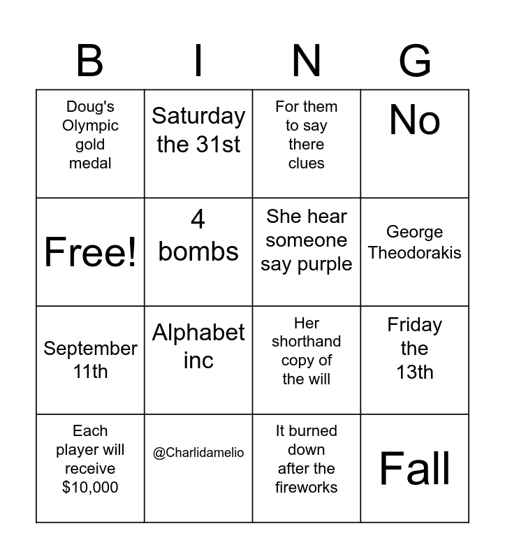 This bingo card has 16 words: @Charlidamelio, Friday the 13th, For them to say there clues, Doug's Olympic gold medal, September 11th, Saturday the 31st, Her shorthand copy of the will, It burned down after the fireworks, Free!, 4 bombs, Each player will receive $10,000, No, Alphabet inc, George Theodorakis, She hear someone say purple and Fall.