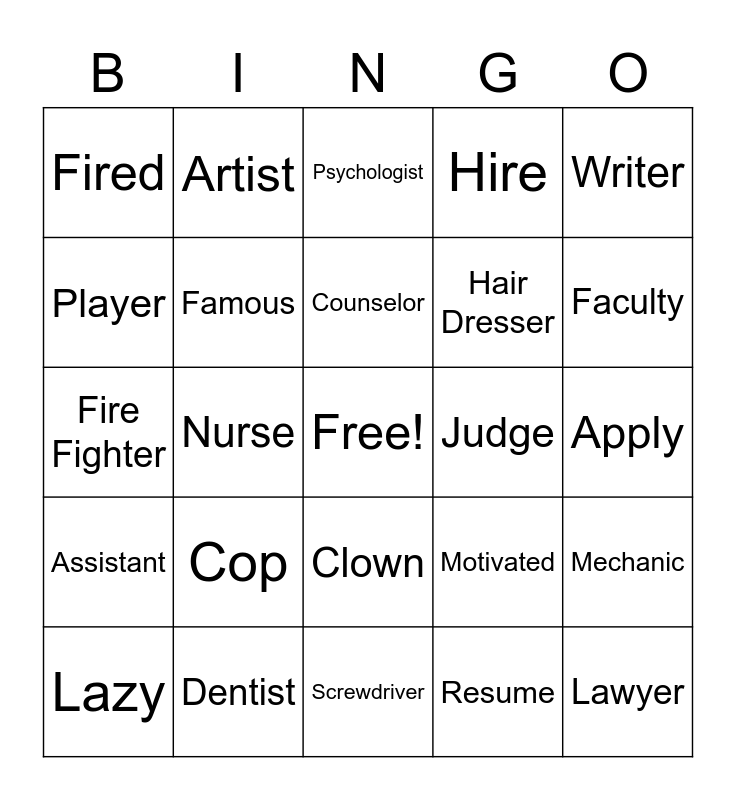 This bingo card has a free space and 24 words: Cop, Dentist, Counselor, Lazy, Writer, Fired, Player, Artist, Judge, Clown, Hair Dresser, Fire Fighter, Motivated, Mechanic, Famous, Resume, Apply, Psychologist, Faculty, Nurse, Lawyer, Assistant, Hire and Screwdriver.
