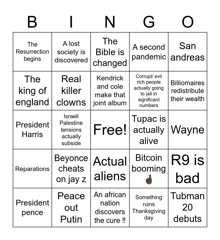 This bingo card has a free space and 24 words: President pence, Beyonce cheats on jay z, Kendrick and cole make that joint album, Something ruins Thanksgiving day, San andreas, The Resurrection begins, A lost society is discovered, The Bible is changed, Tupac is actually alive, Wayne, President Harris, Real killer clowns, Bitcoin booming 🤞🏿, R9 is bad, The king of england, Peace out Putin, An african nation discovers the cure ‼, A second pandemic, Billiomaires redistribute their wealth, Reparations, Israeli Palestine tensions actually subside, Actual aliens, Corrupt/ evil rich people actually going to jail in significant numbers and Tubman 20 debuts.