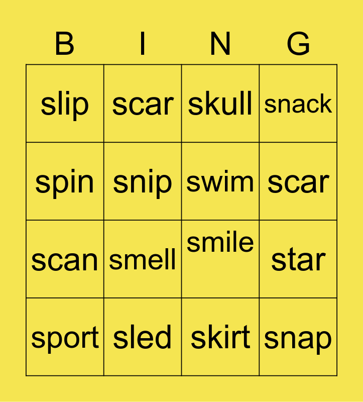 This bingo card has 20 words: star, stop, skull, skin, sport, spin, sled, slip, scan, scar, smell, smile, snip, snap, swim, swift, scar, snack, skirt and stamp.