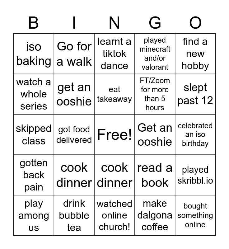 This bingo card has a free space and 24 words: cook dinner, drink bubble tea, eat takeaway, play among us, find a new hobby, iso baking, watch a whole series, Go for a walk, Get an ooshie, cook dinner, FT/Zoom for more than 5 hours, skipped class, read a book, played skribbl.io, get an ooshie, make dalgona coffee, celebrated an iso birthday, learnt a tiktok dance, slept past 12, got food delivered, bought something online, gotten back pain, played minecraft and/or valorant and watched online church!.