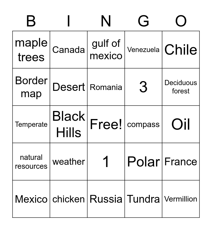 This bingo card has a free space and 24 words: weather, chicken, Romania, Mexico, Chile, maple trees, Border map, Canada, compass, 1, 3, Temperate, Polar, France, Desert, Tundra, Oil, gulf of mexico, Deciduous forest, Black Hills, Vermillion, natural resources, Venezuela and Russia.