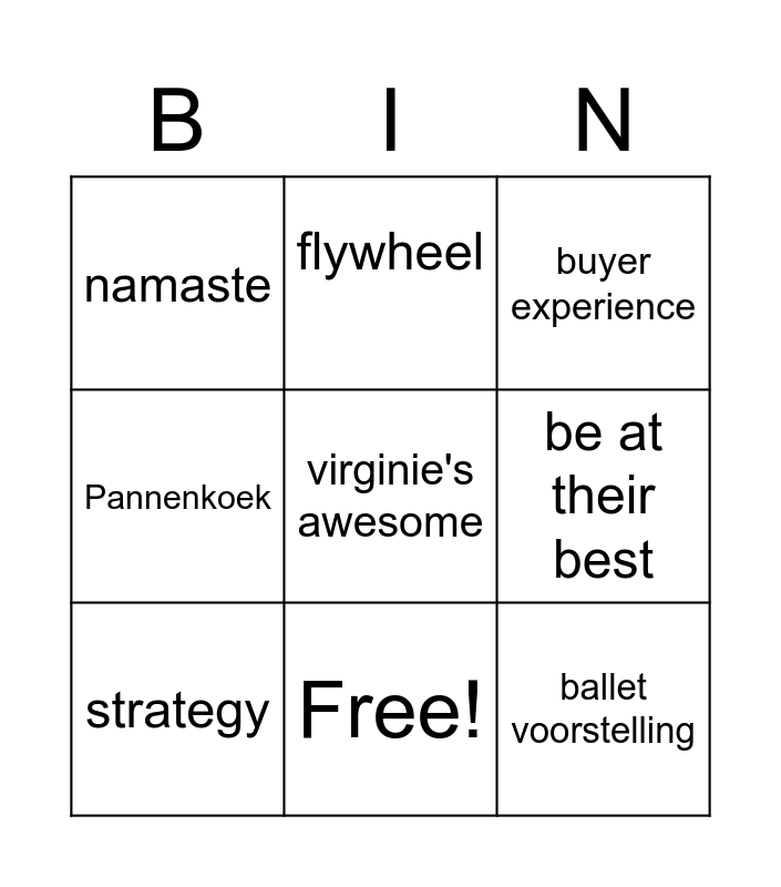 This bingo card has 9 words: strategy, buyer experience, flywheel, Pannenkoek, namaste, be at their best, virginie's awesome, ballet voorstelling and Free!.