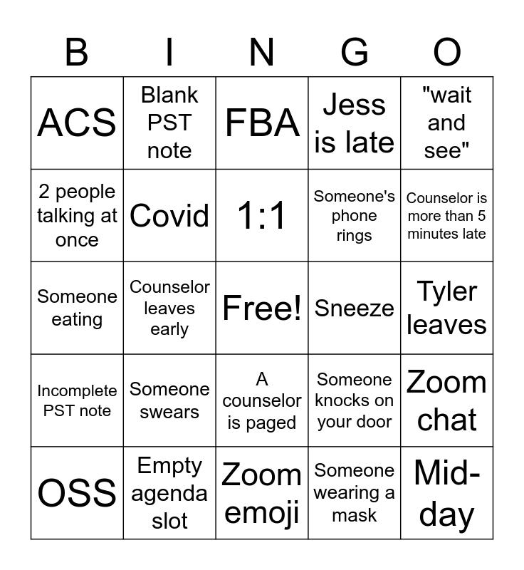 This bingo card has a free space and 41 words: BIP, Someone eating, Jess leaves, Covid, Empty agenda slot, A counselor is paged, 1:1, Complete PST note, "wait and see", Incomplete PST note, Counselor leaves early, Jess is late, Mid-day, Tyler leaves, Sneeze, Someone swears, ROD, ACS, coronavirus, FBA, Zoom chat, Support Room, Zoom emoji, Someone's phone rings, Teacher is absent, Talking while muted, Someone wearing a mask, STS, Counselor is more than 5 minutes late, School store, 2 or more people in 1 room, Blank PST note, OSS, Cough, Someone knocks on your door, 2 people talking at once, ICMP, Agenda item bumped to next week, Pandemic, "contact the district" and Video turned off.