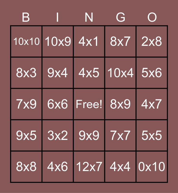 This bingo card has a free space and 24 words: 8x8, 3x2, 4x5, 4x4, 2x8, 10x10, 10x9, 4x1, 8x9, 4x7, 7x9, 9x4, 7x7, 5x5, 8x3, 4x6, 12x7, 8x7, 5x6, 9x5, 6x6, 9x9, 10x4 and 0x10.