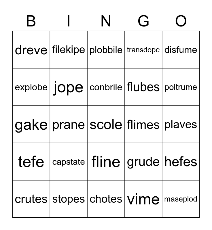 This bingo card has 25 words: capstate, chotes, conbrile, crutes, disfume, dreve, explobe, filekipe, flimes, fline, flubes, gake, grude, hefes, jope, maseplod, plaves, plobbile, poltrume, prane, scole, stopes, tefe, transdope and vime.