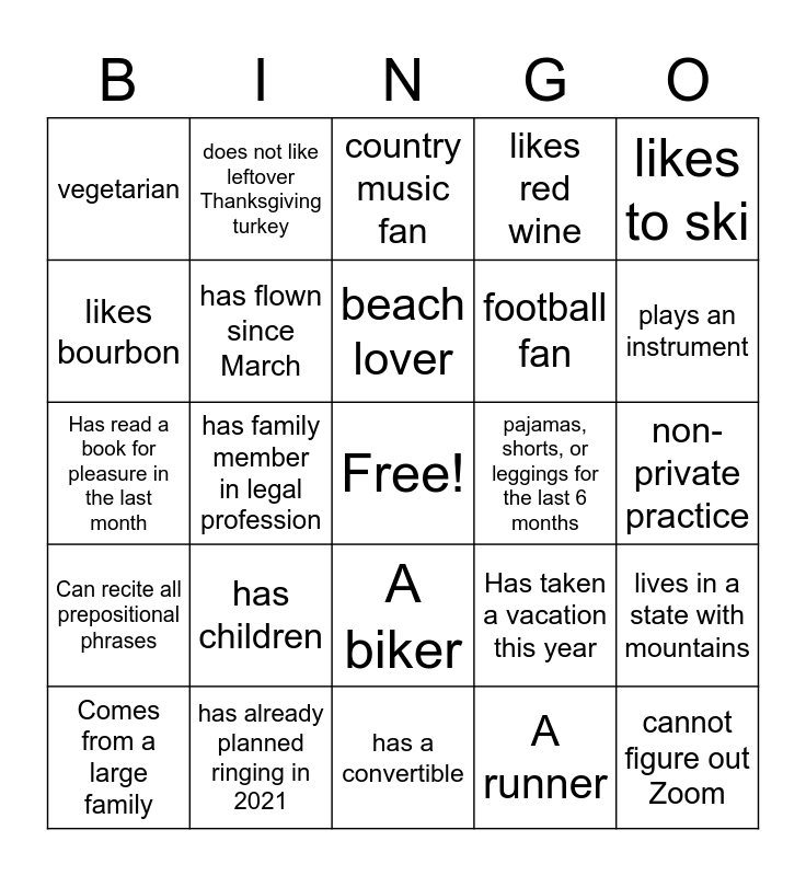 This bingo card has a free space and 24 words: has children, has already planned ringing in 2021, beach lover, Comes from a large family, likes to ski, vegetarian, likes bourbon, does not like leftover Thanksgiving turkey, pajamas, shorts, or leggings for the last 6 months, A biker, football fan, Has read a book for pleasure in the last month, Has taken a vacation this year, lives in a state with mountains, has flown since March, A runner, non-private practice, country music fan, plays an instrument, has family member in legal profession, cannot figure out Zoom, Can recite all prepositional phrases, likes red wine and has a convertible.