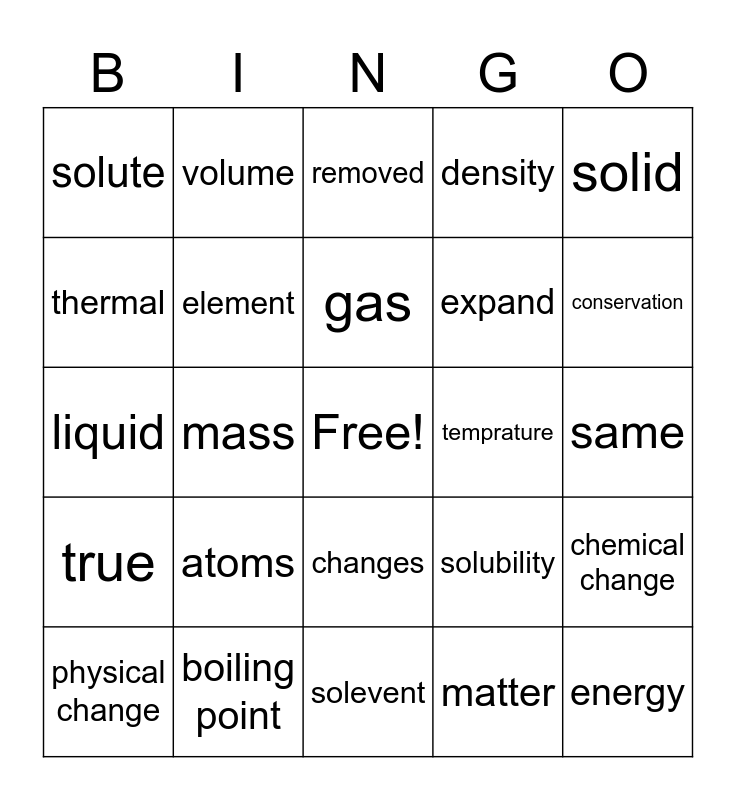 This bingo card has a free space and 24 words: atoms, boiling point, gas, physical change, solid, solute, thermal, volume, temprature, changes, expand, liquid, solubility, chemical change, element, matter, same, removed, conservation, mass, energy, true, density and solevent.
