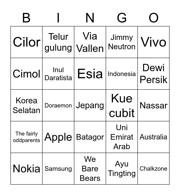 This bingo card has a free space and 24 words: Apple, Samsung, Esia, Nokia, Vivo, Cilor, Cimol, Telur gulung, Kue cubit, Batagor, Indonesia, Korea Selatan, Uni Emirat Arab, Australia, Inul Daratista, Ayu Tingting, Nassar, Via Vallen, Dewi Persik, Doraemon, Chalkzone, The fairly oddparents, Jimmy Neutron and We Bare Bears.