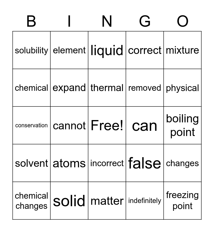 This bingo card has a free space and 24 words: atoms, solid, thermal, chemical changes, mixture, solubility, chemical, element, can, incorrect, removed, conservation, false, changes, expand, indefinitely, boiling point, liquid, physical, cannot, freezing point, solvent, correct and matter.