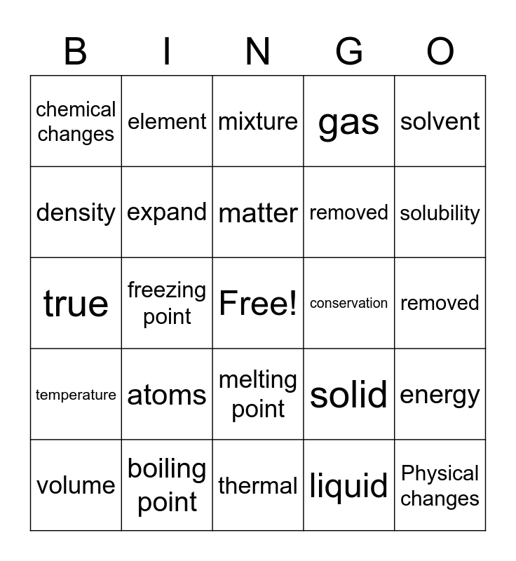 This bingo card has a free space and 24 words: atoms, boiling point, matter, volume, solvent, chemical changes, density, element, conservation, melting point, removed, true, solid, energy, expand, liquid, removed, mixture, solubility, freezing point, Physical changes, temperature, gas and thermal.