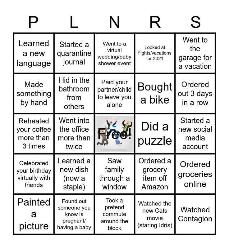 This bingo card has a free space and 78 words: Forgot someone's name because you've been in quarantine so long, Lost your phone in your own home, Went to a virtual wedding/baby shower event, Did online shopping (with nowhere to go), Ordered a whole pizza for yourself, Cried watching a TV show, Ate dessert for breakfast, Redecorated, Gave yourself a haircut/bangs, Took a photo of your takeout, Got dressed for a meeting only waist up, Danced by yourself, Looked at flights/vacations for 2021, Learned a new language, Finished more than one book, Made something by hand, Got a new pet, Learned a new dish (now a staple), Took your office chair home, Started a new social media account, Enjoyed a restaurant patio, Went to the garage for a vacation, Reheated your coffee more than 3 times, Paid your partner/child to leave you alone, Hid in the bathroom from others, Asked Alexa/Google what day it was, Took family photos, Did not leave the house in 7 days, Did not leave the house in 14 days, Made dinner 3 nights in a row, Ordered out 3 days in a row, Counted your toilet paper rolls, Took a pretend commute around the block, Googled covid symptoms after a cough, Painted a picture, Did a puzzle, Tried to make sourdough starter, Made banana bread, Watched the US Presidential debate, Watched Contagion, Napped during lunch, Binged the Tiger King series, Forgot to brush your teeth, Stood in an LCBO line, Went to the store to only buy wine/beer, Started a quarantine journal, Canceled a planned vacation, Downloaded TikTok, Uninstalled TikTok, Did an online fitness class, Ordered groceries online, Went into the office more than twice, Ordered a grocery item off Amazon, Signed up for Amazon Prime, Uploaded a TikTok video, Cleaned something you’ve never cleaned before, Found something that was lost, Used up all of your data, Ate an entire cake by yourself, Saw family through a window, Bought a bike, Went on a wine tour, Went to Downey’s Farm, Went to Rattlesnake Point, Went to the beach, Played the lottery at least twice, Hurt your back, Lost your quarantine weight, Celebrated your birthday virtually with friends, Found out someone you know is pregnant/ having a baby, Thought the Blue Jays were going to win, Thought the Raptors were going to win, Volunteered, Took a flight between Jan-March 2020, Watched the new Cats movie (staring Idris), Worried about murder hornets, Made Dalgona coffee and Made your own mask.
