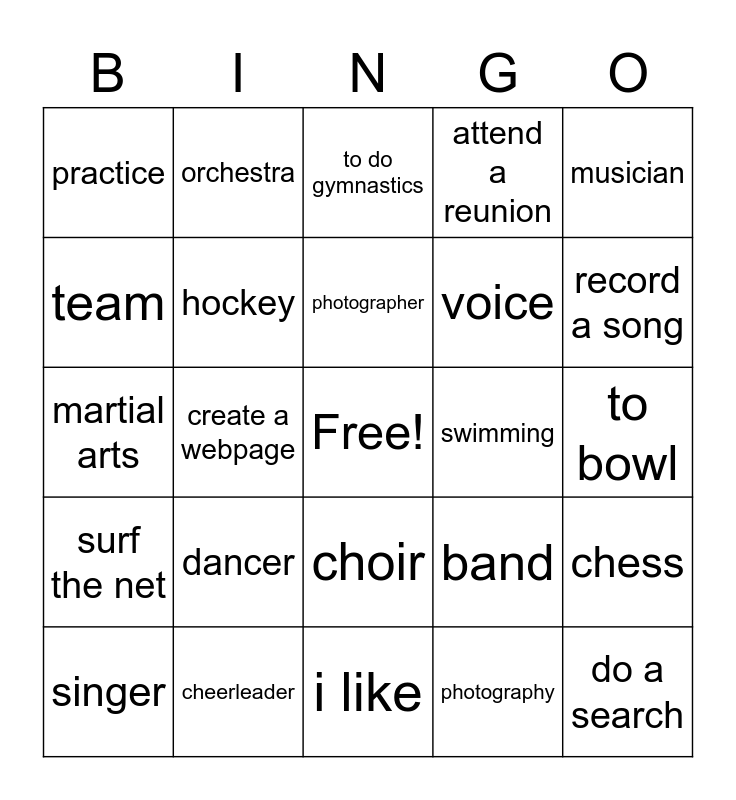 This bingo card has a free space and 24 words: dancer, cheerleader, photographer, singer, musician, practice, team, orchestra, swimming, choir, voice, martial arts, band, chess, hockey, photography, to bowl, to do gymnastics, record a song, create a webpage, do a search, surf the net, attend a reunion and i like.