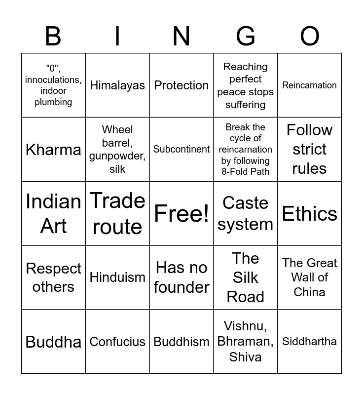This bingo card has a free space and 25 words: Hinduism, Buddhism, Subcontinent, Buddha, Reincarnation, "0", innoculations, indoor plumbing, Kharma, Himalayas, Caste system, Has no founder, Break the cycle of reincarnation by following 8-Fold Path, Indian Art, The Silk Road, The Great Wall of China, Wheel barrel, gunpowder, silk, Confucianism, Ethics, Protection, Follow strict rules, Trade route, Siddhartha, Confucius, Respect others, Reaching perfect peace stops suffering and Vishnu, Bhraman, Shiva.
