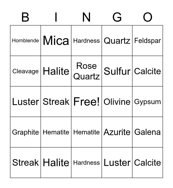 This bingo card has a free space and 50 words: Fracture, Calcite, Conglomerate, Hardness, Hematite, Luster, Mica, Pyroxene, Cleavage, Nonmetallic Luster, Halite, Quartz, Galena, Azurite, Color, Gypsum, Rose Quartz, Olivine, Metallic Luster, Feldspar, Streak, Luster, Hornblende, Sulfur, Graphite, Fracture, Calcite, Conglomerate, Hardness, Hematite, Mica, Pyroxene, Cleavage, Nonmetallic Luster, Halite, Quartz, Galena, Azurite, Color, Gypsum, Rose Quartz, Olivine, Metallic Luster, Feldspar, Streak, Luster, Hornblende, Sulfur, Graphite and Moh’s Scale.