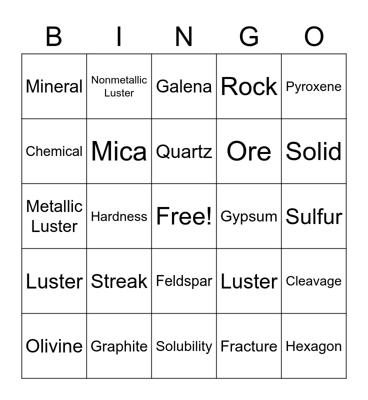 This bingo card has a free space and 32 words: Fracture, Calcite, Hardness, Hematite, Luster, Mica, Pyroxene, Cleavage, Nonmetallic Luster, Halite, Quartz, Galena, Azurite, Color, Gypsum, Rose Quartz, Olivine, Metallic Luster, Feldspar, Streak, Luster, Hornblende, Sulfur, Graphite, Hexagon, Rock, Ore, Chemical, Mineral, Solubility, Physical and Solid.