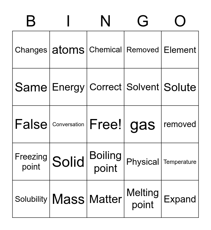 This bingo card has a free space and 24 words: Solid, Mass, Correct, Solubility, Element, Changes, Same, atoms, gas, Boiling point, Solvent, False, Physical, Temperature, Energy, Melting point, removed, Chemical, Solute, Conversation, Expand, Freezing point, Removed and Matter.