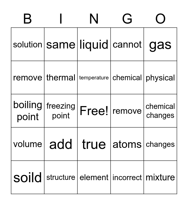 This bingo card has a free space and 24 words: add, structure, temperature, soild, gas, solution, remove, same, remove, true, chemical, boiling point, atoms, changes, thermal, incorrect, chemical changes, liquid, physical, freezing point, mixture, volume, cannot and element.