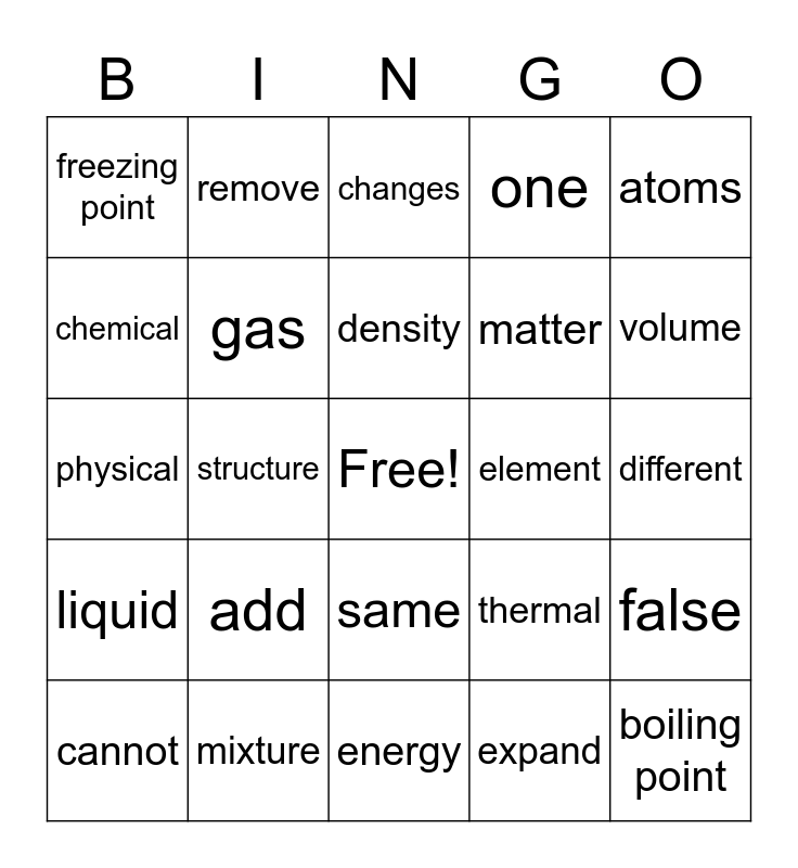This bingo card has a free space and 24 words: add, mixture, density, cannot, atoms, freezing point, chemical, remove, element, same, matter, physical, thermal, false, gas, expand, different, changes, volume, structure, boiling point, liquid, one and energy.
