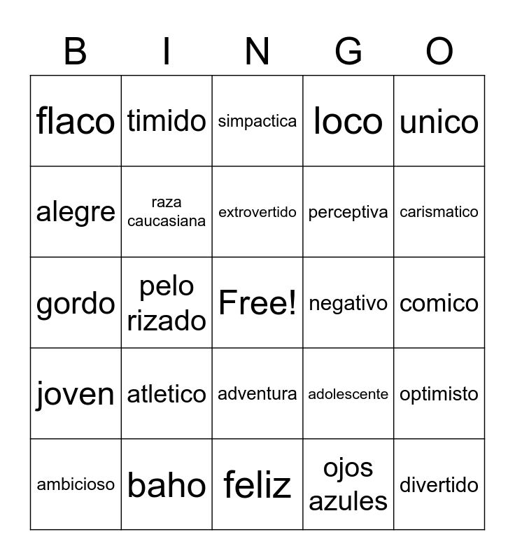 This bingo card has a free space and 24 words: atletico, baho, extrovertido, ambicioso, unico, flaco, alegre, timido, negativo, adventura, perceptiva, gordo, adolescente, optimisto, raza caucasiana, ojos azules, comico, simpactica, carismatico, pelo rizado, divertido, joven, loco and feliz.