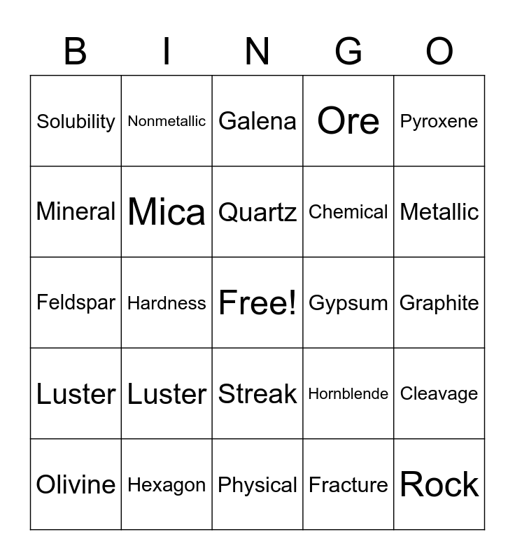 This bingo card has a free space and 32 words: Fracture, Calcite, Hardness, Hematite, Luster, Mica, Pyroxene, Cleavage, Nonmetallic, Halite, Quartz, Galena, Azurite, Color, Gypsum, Rose Quartz, Olivine, Feldspar, Streak, Luster, Hornblende, Sulfur, Graphite, Hexagon, Rock, Ore, Chemical, Mineral, Solubility, Physical, Solid and Metallic.