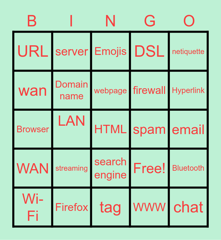 This bingo card has 25 words: streaming, tag, webpage, Wi-Fi, netiquette, URL, wan, server, spam, search engine, firewall, Browser, Free!, Bluetooth, Domain name, chat, email, Emojis, Hyperlink, LAN, HTML, Firefox, WAN, DSL and WWW.