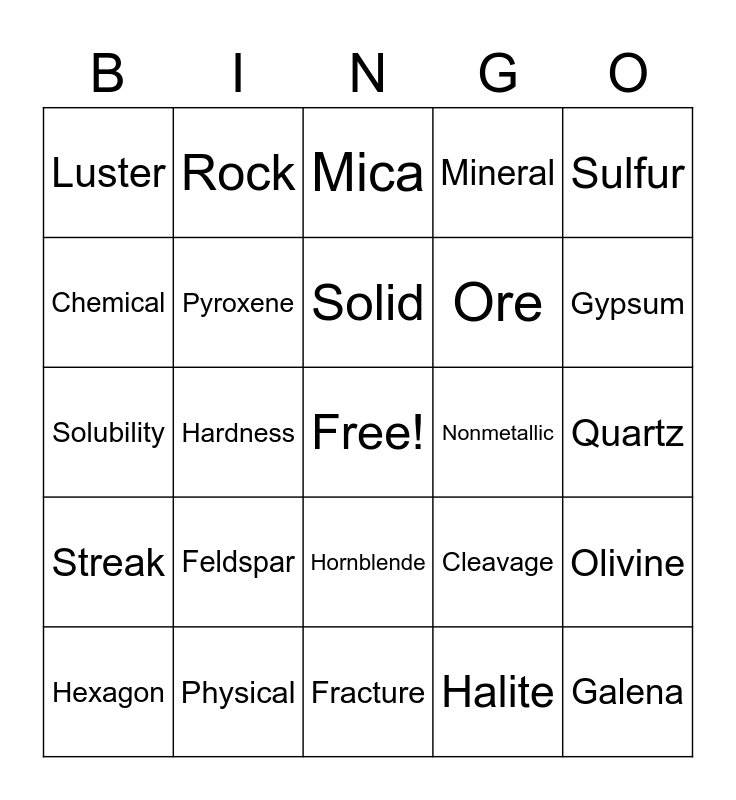 This bingo card has a free space and 31 words: Fracture, Calcite, Hardness, Hematite, Luster, Mica, Pyroxene, Cleavage, Nonmetallic, Halite, Quartz, Galena, Azurite, Color, Gypsum, Rose Quartz, Olivine, Feldspar, Streak, Hornblende, Sulfur, Graphite, Hexagon, Rock, Ore, Chemical, Mineral, Solubility, Physical, Solid and Metallic.