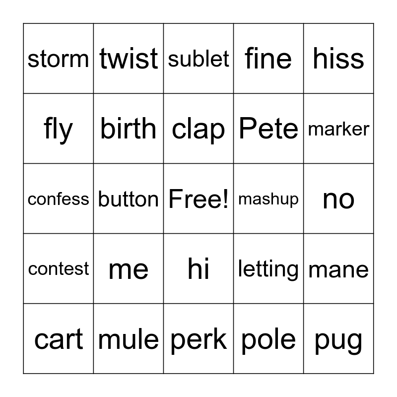 This bingo card has a free space and 29 words: cart, date, button, we, storm, sublet, birth, me, mashup, mule, no, pug, perk, pole, marker, same, hi, contest, hiss, confess, letting, curls, Pete, fly, fine, twist, mane, clap and twirl.