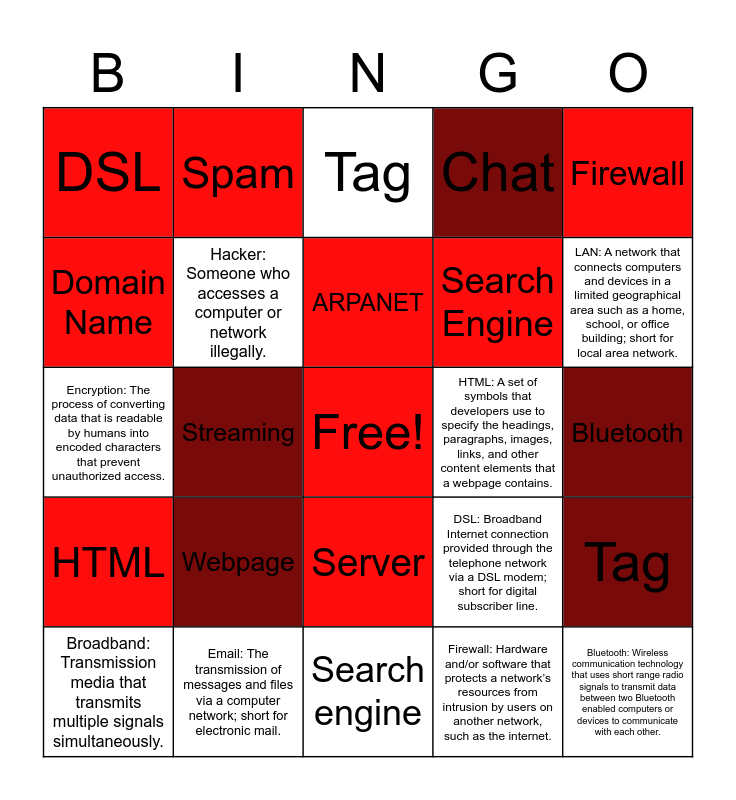 This bingo card has a free space and 65 words: WAN, Wiki, LAN, Tag, Netiquette, WWW, Spam, Hyperlink, ARPANET, Emojis, Server, Blog, Bluetooth, Firewall, Internet, Domain Name, Streaming, DSL, Broadband, Search Engine, Webpage, HTML, Chat, Email, ARPANET, Adware, Bandwidth: The amount of data, instructions, and information that can travel over transmission media., Blog: An informal website consisting of time-stamped articles, or posts, in a diary or journal format, usually listed in reverse chronological order., Bluetooth: Wireless communication technology that uses short range radio signals to transmit data between two Bluetooth enabled computers or devices to communicate with each other., Browser: Software that enables users with an internet connection to access and view webpages on computers or mobile devices., Broadband: Transmission media that transmits multiple signals simultaneously., Chat: A real-time typed conversation that takes place on a computer or mobile device with many other online users., Cookies: A small text file that a web server stores on your computer., Domain name: A text-based name that corresponds to the IP address of a server that hosts a website., DSL: Broadband Internet connection provided through the telephone network via a DSL modem; short for digital subscriber line., Email: The transmission of messages and files via a computer network; short for electronic mail., Emojis: Ideograms and symbols used in online communications to express emotions., Encryption: The process of converting data that is readable by humans into encoded characters that prevent unauthorized access., Firewall: Hardware and/or software that protects a network’s resources from intrusion by users on another network, such as the internet., Firefox: Mozilla Corporation’s web browser., Hacker: Someone who accesses a computer or network illegally., Hashtag: A number sign (#) followed by a keyword that describes and categorizes a Tweet., HTML: A set of symbols that developers use to specify the headings, paragraphs, images, links, and other content elements that a webpage contains., Hyperlink: A connection to other documents, graphics, audio files, videos, web pages, or websites that’s built into a certain website., Internet: A worldwide collection of computer networks that connects millions of businesses, government agencies, educational institutions, and individuals., ISP: A business that provides individuals and organizations access to the internet for a fee; short for internet service providers., LAN: A network that connects computers and devices in a limited geographical area such as a home, school, or office building; short for local area network., Malware: Programs that act without a user’s knowledge and deliberately alter the operations of computers and mobile devices; short for malicious software., Netiquette, Password, PIN, Piracy, Server, Search engine, Spyware, Spam, Streaming, Tag, VoIP, URL, WAN, Webpage, WWW, WiFi and Wiki.
