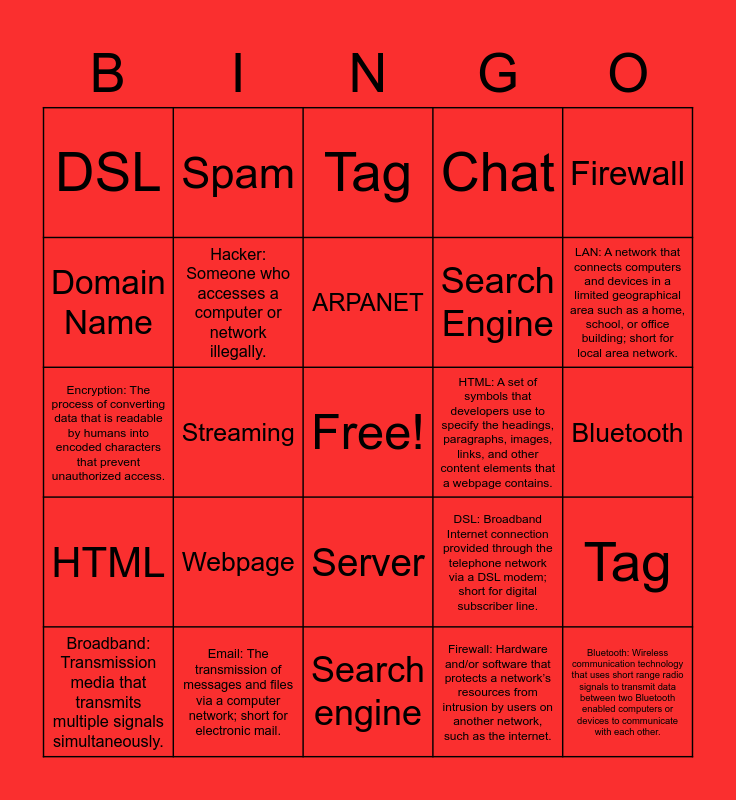 This bingo card has a free space and 65 words: WAN, Wiki, LAN, Tag, Netiquette, WWW, Spam, Hyperlink, ARPANET, Emojis, Server, Blog, Bluetooth, Firewall, Internet, Domain Name, Streaming, DSL, Broadband, Search Engine, Webpage, HTML, Chat, Email, ARPANET, Adware, Bandwidth: The amount of data, instructions, and information that can travel over transmission media., Blog: An informal website consisting of time-stamped articles, or posts, in a diary or journal format, usually listed in reverse chronological order., Bluetooth: Wireless communication technology that uses short range radio signals to transmit data between two Bluetooth enabled computers or devices to communicate with each other., Browser: Software that enables users with an internet connection to access and view webpages on computers or mobile devices., Broadband: Transmission media that transmits multiple signals simultaneously., Chat: A real-time typed conversation that takes place on a computer or mobile device with many other online users., Cookies: A small text file that a web server stores on your computer., Domain name: A text-based name that corresponds to the IP address of a server that hosts a website., DSL: Broadband Internet connection provided through the telephone network via a DSL modem; short for digital subscriber line., Email: The transmission of messages and files via a computer network; short for electronic mail., Emojis: Ideograms and symbols used in online communications to express emotions., Encryption: The process of converting data that is readable by humans into encoded characters that prevent unauthorized access., Firewall: Hardware and/or software that protects a network’s resources from intrusion by users on another network, such as the internet., Firefox: Mozilla Corporation’s web browser., Hacker: Someone who accesses a computer or network illegally., Hashtag: A number sign (#) followed by a keyword that describes and categorizes a Tweet., HTML: A set of symbols that developers use to specify the headings, paragraphs, images, links, and other content elements that a webpage contains., Hyperlink: A connection to other documents, graphics, audio files, videos, web pages, or websites that’s built into a certain website., Internet: A worldwide collection of computer networks that connects millions of businesses, government agencies, educational institutions, and individuals., ISP: A business that provides individuals and organizations access to the internet for a fee; short for internet service providers., LAN: A network that connects computers and devices in a limited geographical area such as a home, school, or office building; short for local area network., Malware: Programs that act without a user’s knowledge and deliberately alter the operations of computers and mobile devices; short for malicious software., Netiquette, Password, PIN, Piracy, Server, Search engine, Spyware, Spam, Streaming, Tag, VoIP, URL, WAN, Webpage, WWW, WiFi and Wiki.