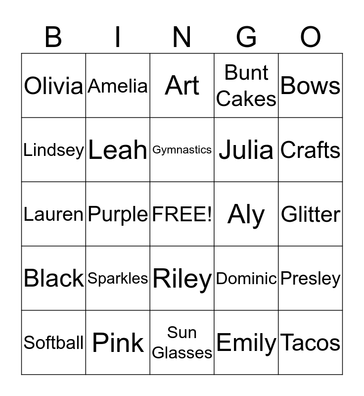 This bingo card has a free space and 24 words: Sparkles, Pink, Gymnastics, Softball, Bows, Olivia, Lindsey, Amelia, Aly, Riley, Julia, Lauren, Dominic, Presley, Leah, Emily, Glitter, Art, Crafts, Purple, Tacos, Black, Bunt Cakes and Sun Glasses.