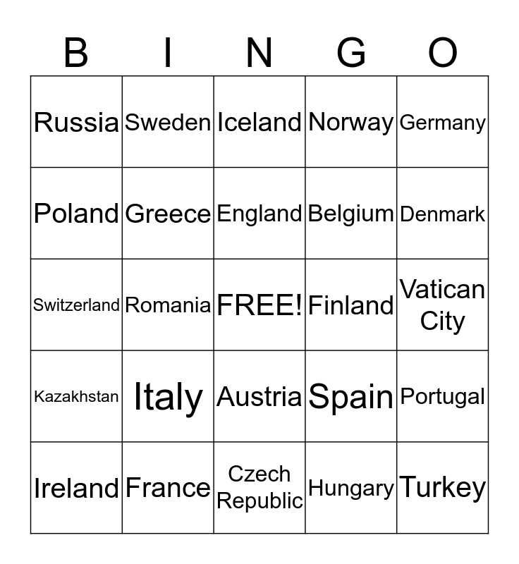 This bingo card has a free space and 24 words: Italy, France, England, Ireland, Germany, Russia, Poland, Sweden, Finland, Austria, Belgium, Switzerland, Spain, Portugal, Greece, Hungary, Vatican City, Iceland, Denmark, Romania, Turkey, Kazakhstan, Norway and Czech Republic.