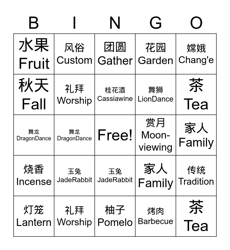 ⚠ This card has duplicate items: 后羿Hou Yi (2), 茶Tea (2), 灯笼Lantern (2), 柚子Pomelo (2), 玉兔JadeRabbit (2), 烧香Incense (2), 风俗Custom (2), 满月FullMoon (2), 秋天Fall (2), 夜空Nightsky (2), 礼拜Worship (2), 花园Garden (2), 传统Tradition (2), 家人Family (2), 中秋Mid-Autumn (2), 月饼Mooncake (2), 桂花酒Cassiawine (2), 赏月Moon-viewing (2), 团圆Gather (2), 嫦娥Chang'e (2), 舞龙DragonDance (2), 烤肉Barbecue (2), 水果Fruit (2), 舞狮LionDance (2)