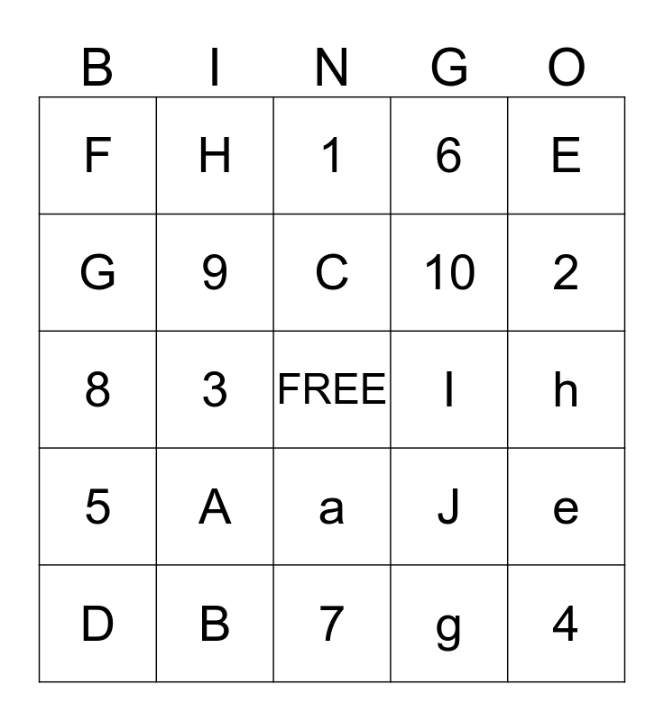 This bingo card has a free space and 24 words: A, B, C, D, E, F, G, H, I, a, 10, 8, J, e, 9, g, h, 1, 2, 3, 4, 5, 6 and 7.