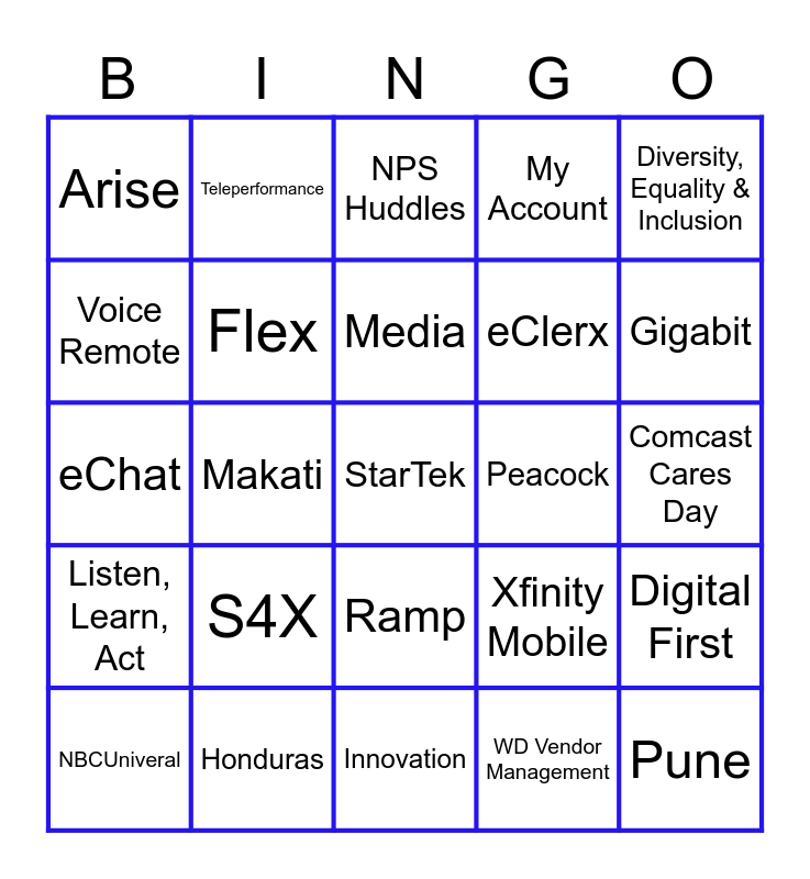 This bingo card has 30 words: Honduras, eNPS Shoutouts, Makati, Sky, Arise, NPS Huddles, Flex, Ramp, Peacock, Innovation, Comcast Cares Day, StarTek, WD Vendor Management, Pune, Gigabit, Bacolod, Xfinity Mobile, Listen, Learn, Act, S4X, Diversity, Equality & Inclusion, eChat, Xfinity, Teleperformance, eClerx, Voice Remote, My Account, Digital First, NBCUniveral, Media and OTT.