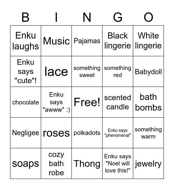 This bingo card has a free space and 24 words: roses, cozy bath robe, something sweet, soaps, White lingerie, Enku laughs, Enku says "cute"!, Music, scented candle, polkadots, something red, chocolate, Enku says "phenomenal", something warm, lace, Enku says "Noel will love this!", bath bombs, Pajamas, Babydoll, Enku says "awww" :), jewelry, Negligee, Black lingerie and Thong.