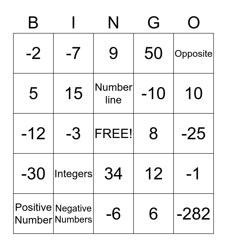 This bingo card has a free space and 24 words: Integers, Negative Numbers, Number line, Positive Number, Opposite, -2, 5, -7, 8, 34, -10, -12, 12, -1, 15, 6, -25, 9, 10, -3, -282, -30, 50 and -6.