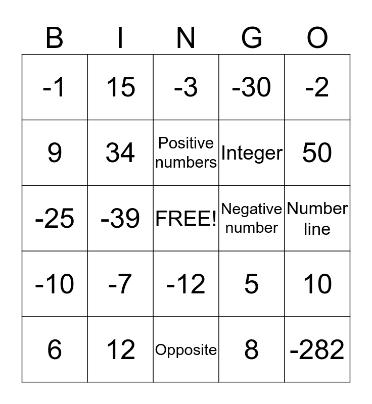 This bingo card has a free space and 24 words: -7, 12, Positive numbers, 6, -2, -1, 9, 15, Negative number, -12, Integer, -25, 5, 10, 34, 8, Number line, -3, 50, -39, -282, -10, -30 and Opposite.