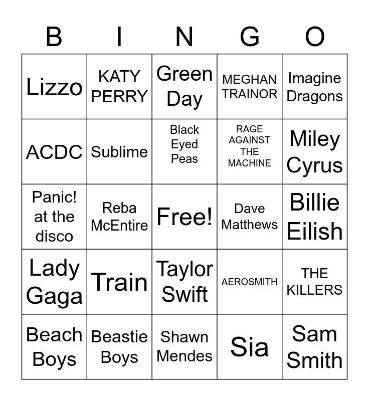 This bingo card has a free space and 29 words: Beach Boys, Alanis Morissette, Reba McEntire, Ariana Grande, Lizzo, Green Day, Sublime, Train, Dave Matthews, Beastie Boys, Billie Eilish, Sam Smith, Shawn Mendes, Sia, Miley Cyrus, Alicia Keys, Taylor Swift, Lady Gaga, Imagine Dragons, Panic! at the disco, AEROSMITH, THE DOORS, RAGE AGAINST THE MACHINE, ACDC, MEGHAN TRAINOR, KATY PERRY, THE KILLERS, Black Eyed Peas and Shakira.