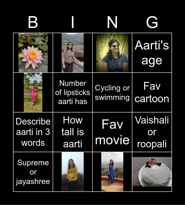 This bingo card has 7 images and 9 words: Vaishali or roopali, Describe aarti in 3 words, Fav movie, Number of lipsticks aarti has, Supreme or jayashree, Aarti's age, How tall is aarti, Fav cartoon and Cycling or swimming.