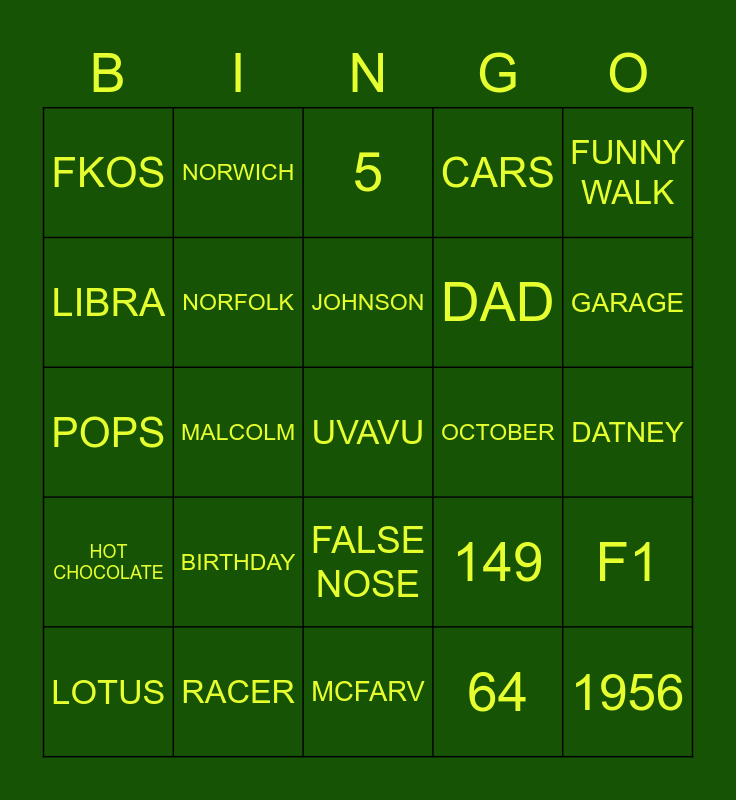 This bingo card has 29 words: LOTUS, CODY, MALCOLM, 1956, FKOS, 5, NORFOLK, BIRTHDAY, OCTOBER, RACER, DATNEY, UVAVU, MCFARV, 64, GARAGE, PILOT, FALSE NOSE, HOT CHOCOLATE, FUNNY WALK, POPS, 149, HUSBAND, DAD, LIBRA, CARS, NORWICH, F1, JOHNSON and STACKYARD.