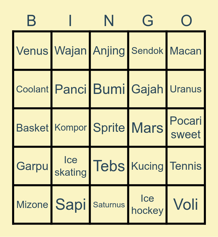 This bingo card has a free space and 24 words: Mizone, Ice skating, Bumi, Ice hockey, Macan, Venus, Wajan, Anjing, Mars, Pocari sweet, Basket, Panci, Kucing, Tennis, Coolant, Sapi, Saturnus, Sendok, Uranus, Garpu, Kompor, Tebs, Gajah and Voli.