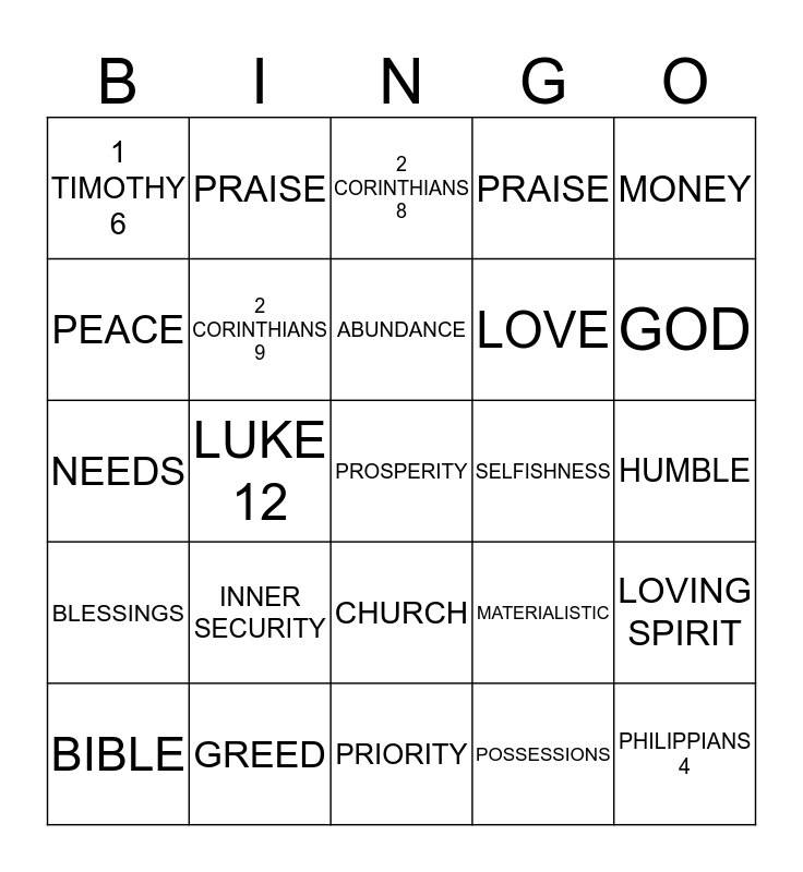 This bingo card has 29 words: BIBLE, JESUS, LUKE 12, PHILIPPIANS 4, 1 TIMOTHY 6, 2 CORINTHIANS 8, 2 CORINTHIANS 9, INNER SECURITY, SELFISHNESS, GREED, HUMBLE, PROSPERITY, PRIORITY, POSSESSIONS, GOD, FAMILY, CHURCH, BLESSINGS, MONEY, NEEDS, MATERIALISTIC, STRENGTH, LOVE, PEACE, PRAISE, PRAISE, LOVING SPIRIT, ABUNDANCE and SACRIFICE.
