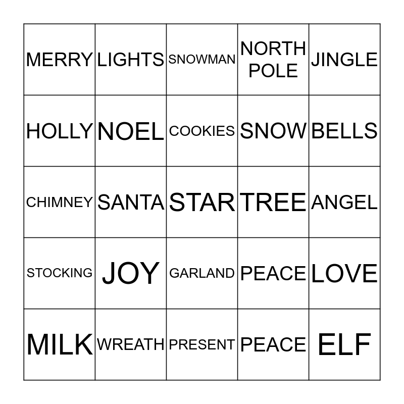 This bingo card has a free space and 24 words: JOY, WREATH, COOKIES, MILK, JINGLE, MERRY, HOLLY, LIGHTS, TREE, GARLAND, SNOW, CHIMNEY, PEACE, LOVE, NOEL, PEACE, ANGEL, SNOWMAN, BELLS, SANTA, ELF, STOCKING, NORTH POLE and PRESENT.