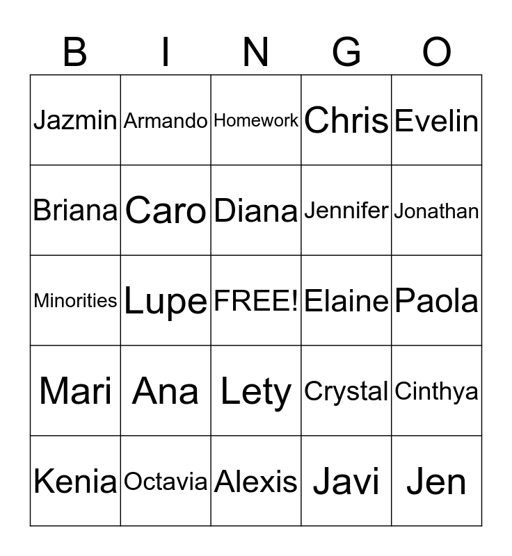 This bingo card has a free space and 46 words: Red Sofa, Jen, Dr. Jane, Alexis, Ana, Andrew, Armando, Arshad, Briana, Caren, Caro, Chris, Cinthya, Crystal, Temo, Danielle, Diana, Elaine, Emerald, Evelin, Lupe, Javi, Jazmin, Jennifer, Jesus, Jonathan, Kenia, Kiara, Lety, Mari, Marisol, Martin, Miriam, Nancy, Nathalie, Octavia, Paola, Priscilla, Saul, Stephanie, Wil, Homework, Minorities, Study Hall, Retreat and Eight Hours.