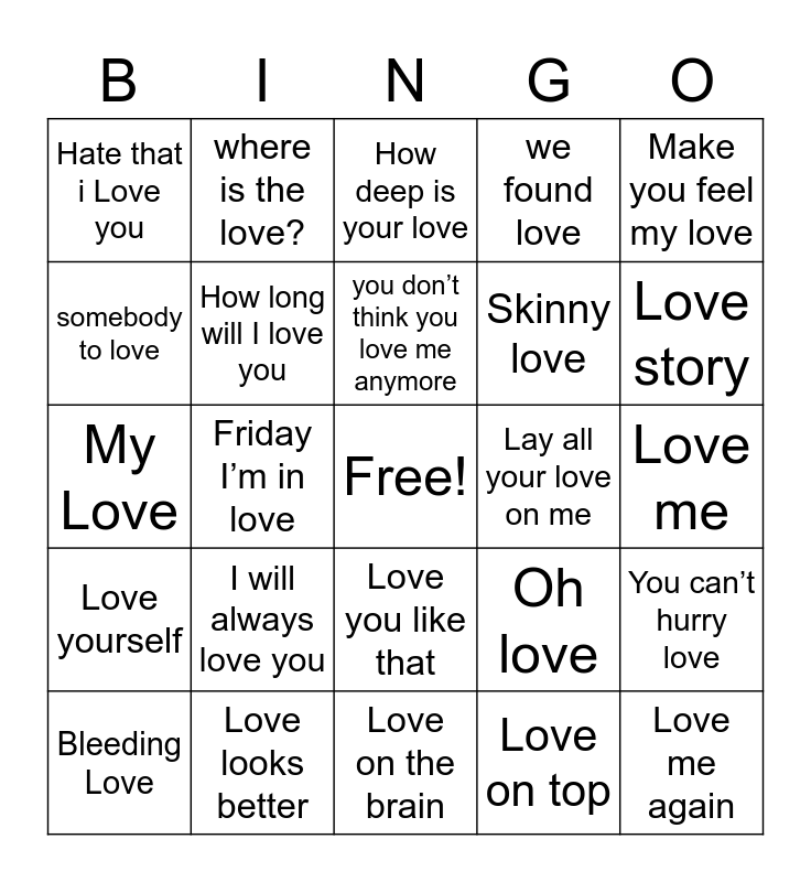 This bingo card has a free space and 29 words: Bleeding Love, Electric Love, Friday I’m in love, Give me Love, Hate that i Love you, How deep is your love, How long will I love you, I will always love you, Lay all your love on me, Love looks better, Love me, Love me again, Love on the brain, Love on top, Love story, Love you like a love song, Love you like that, Love yourself, Make you feel my love, My Love, Oh love, Old school love, Skinny love, somebody to love, we found love, where is the love?, You can’t hurry love, you don’t think you love me anymore and you’ve got the love.
