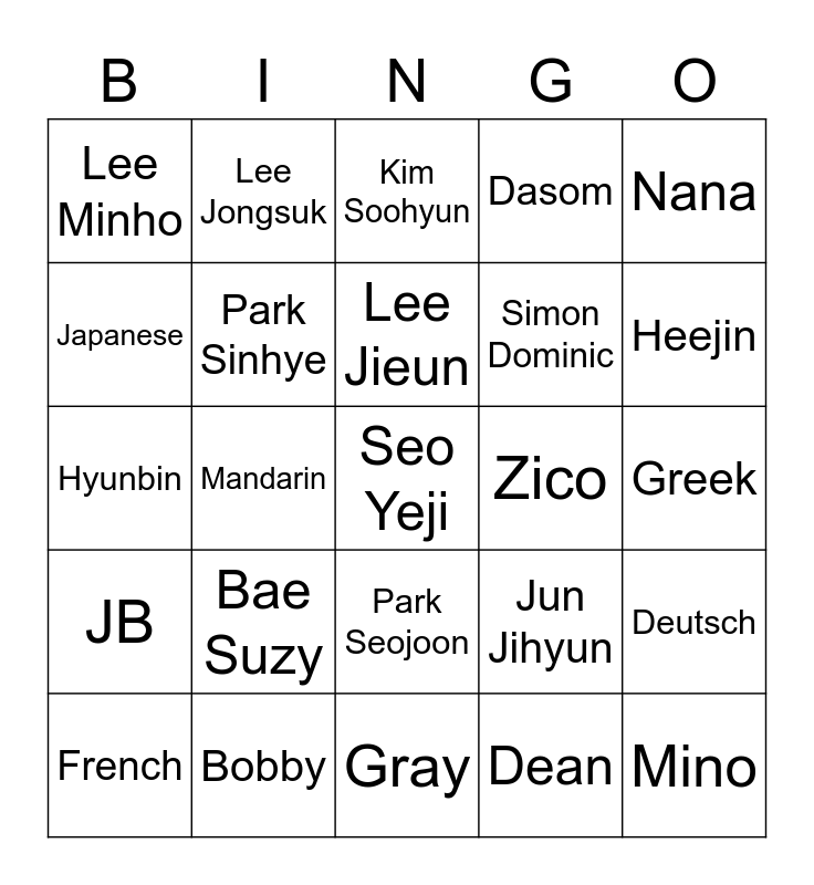 This bingo card has a free space and 24 words: Bae Suzy, Bobby, Lee Jieun, French, Nana, Lee Minho, Japanese, Lee Jongsuk, Zico, Park Seojoon, Simon Dominic, Hyunbin, Jun Jihyun, Deutsch, Park Sinhye, Dean, Greek, Kim Soohyun, Heejin, Mandarin, Mino, JB, Dasom and Gray.